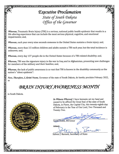 March 2, 2022 – Governor Noem has proclaimed March 2022 as Brain Injury Awareness Month in South Dakota. The Executive Proclamation explains that Traumatic Brain Injury (TBI) is a serious, national public health epidemic that results in a life-altering experience that can include the most serious physical, cognitive, and emotional impairments.