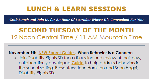 Find more information, register, and watch old sessions from South Dakota Parent Connection’s Lunch and Learn series at the following website: https://www.sdparent.org/online-training/lunch-and-learn-education-sessions