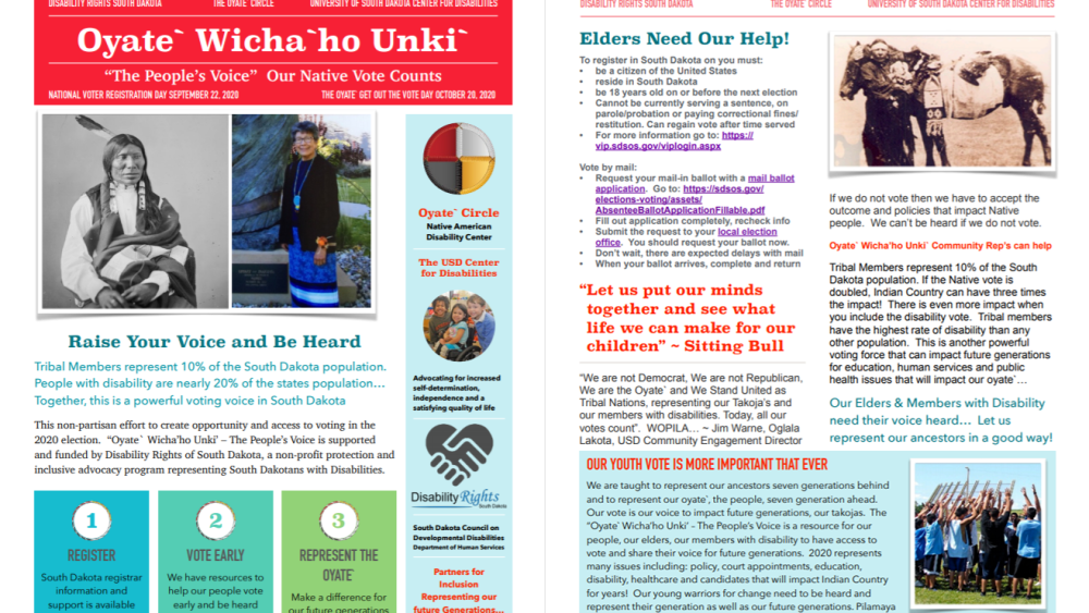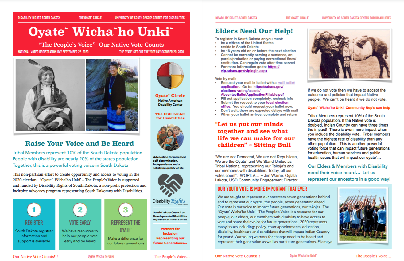 Tribal Members represent 10% of the South Dakota population. People with disability are nearly 20% of the state’s population…Together, this is a powerful voting voice in South Dakota. Oyate` Wicha’ho Unki’ – The People’s Voice, is a non-partisan effort to create opportunity and access to voting in the 2020 election. Learn more in the flyer linked below.